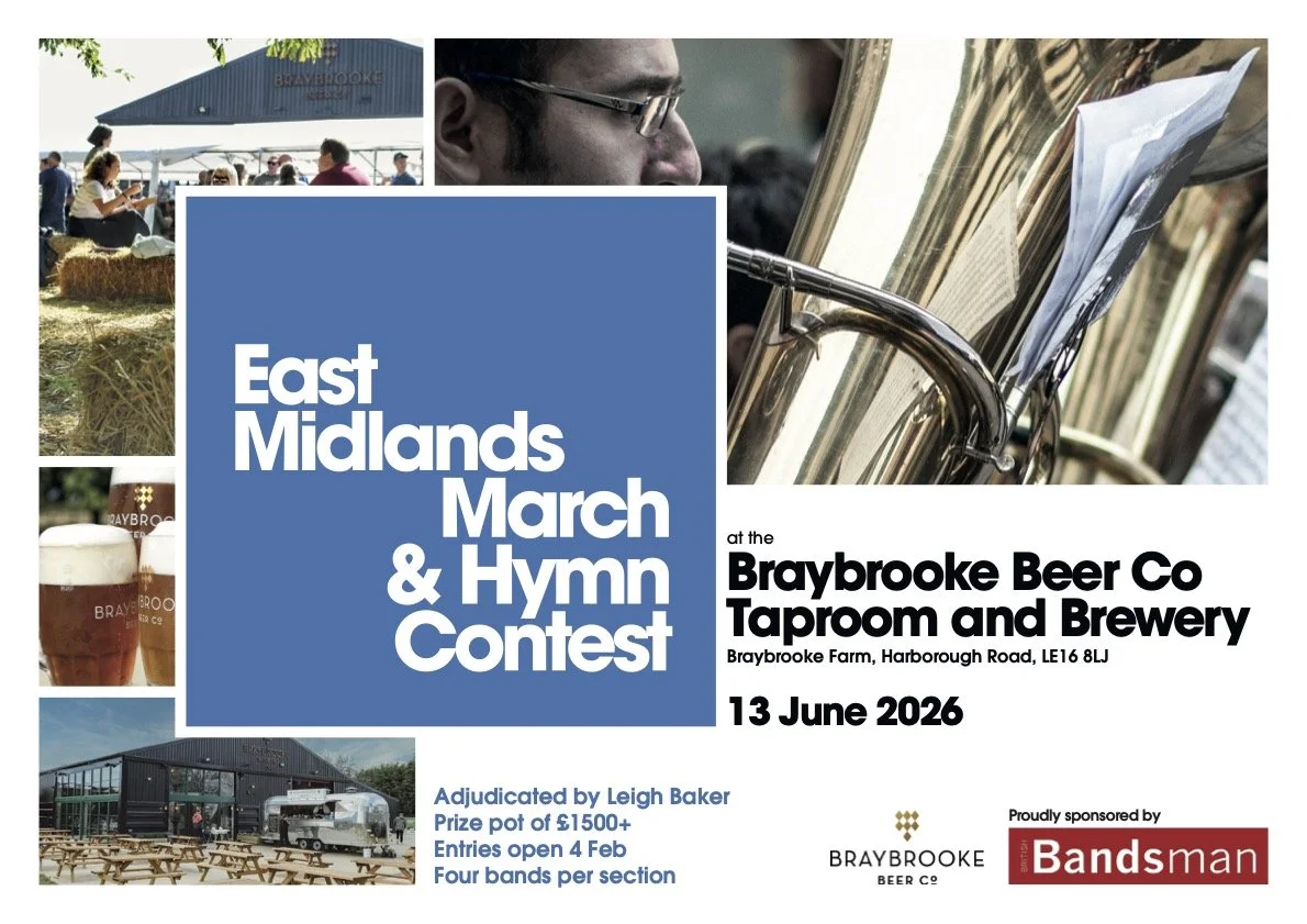 East Midlands March & Hymn Contest makes it’s debut on 13th June, 2026 at the Braybooke Brewery and Taproom, Northamptonshire. With the vastly experienced Leigh Baker as our adjudicator, and a prize pot of over £1,500, our day out at the brewery promises to be full of social and musical allurement.